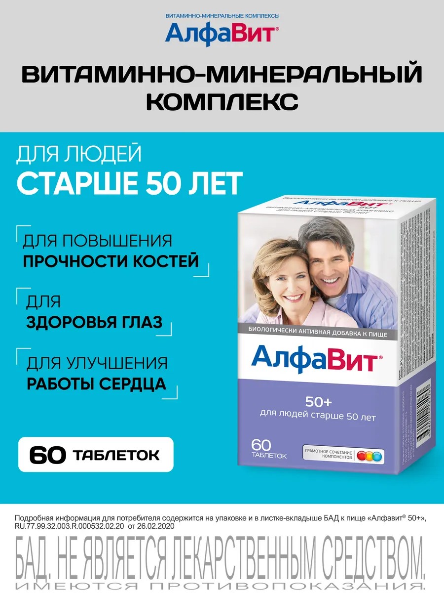 Alphabet 50+, 60 tablets, is a balanced vitamin and mineral complex for people over 50, designed to address the physiological changes that occur with age.