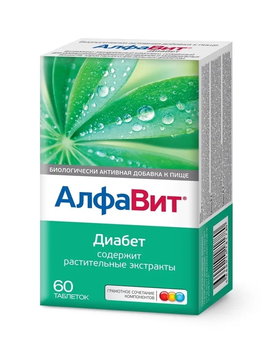 Алфавит Диабет Витамины для больных диабетом и склонных к нему.Учитывает особенности обмена веществ при диабете любого типа (1 и 2).Увеличены дозировки витаминов и минералов, особенно важных при диабете.Содержит липоевую и янтарную кислоты, экстракты растений, которые применяются в профилактике осложнений диабета и положительно влияют на переносимость глюкозы.13 витаминов и 9 минералов, органические кислоты и растительные экстракты. Дозировки учитывают повышенные потребности людей, страдающих диабетом. Кроме того, доказано положительное влияние некоторых микронутриентов на переносимость глюкозы, их эффективность в профилактике таких осложнений диабета, как нефропатия, ретинопатия и др.Противопоказания Индивидуальная непереносимость компонентов, гиперфункция щитовидной железы, беременность и кормление грудью. Перед применением рекомендуется проконсультироваться с врачом.