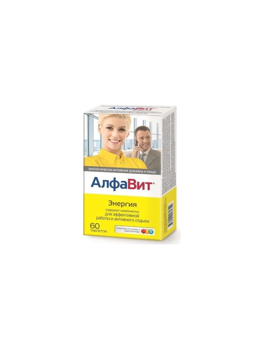 алфавит энергия n60 табл. дополнительный источник витаминов, макро-и микроэлиментов, янтарной к-ты, элеутерозидов, рутина. для эффективной работы и активного отдыха. табл №1 св-желтого цв - витамин в1, с, а, фолиевая к-та, железо, медь, экстракт корневища элеутерококка, экстракт лимонника; табл №2 желто-коричневого цв - витамины с, а, в2, в6, е, никотинамид, цинк, марганец, йод, селен, магний, янтарная к-та, рутин; табл №3 зеленый цв - биотин, пантотенат кальция, витамин в12, к1, d3, фолиевая к-та, хром, кальций. для реализации населению в качестве биологически активной добавки к пище (далее согласно приложению). биологически активные компоненты: таблетка №1, мг/табл.: витамин в1- 2,500±0,375, витамин c- 55±8,25, фолиевая кислота- 0,300±0,045, витамин а- 0,500±0,075, железо- 15,00±2,25, медь- 1,00±0,15, элеутерозиды- 0,500±0,075, схизандрины- 0,500±.0,075. -