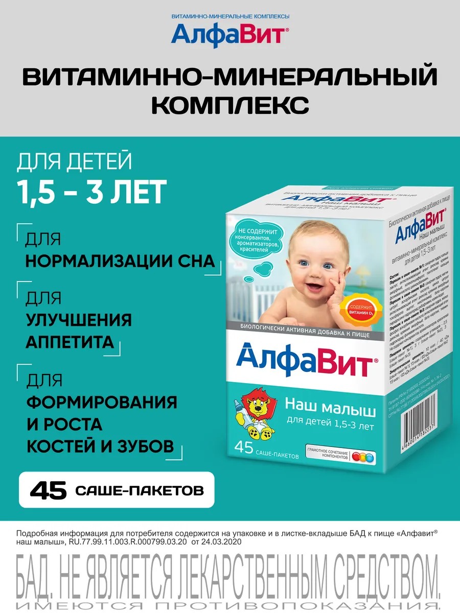 Алфавит Наш малыш, 60 пакетов— это сбалансированные витамины для детей с 1,5 лет, созданные специально для малышей в возрасте от 1 до 3 лет.