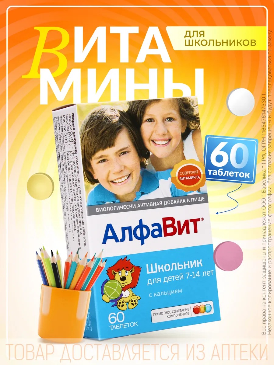 БАД в качестве дополнительного источника витаминов и минеральных веществ (макро- и микроэлементов) для детей от 7 до 14 лет.Витамины алфавит, организм школьника тратит огромное количество энергии на рост и развитие. Часто одного питания недостаточно, чтобы восстановить дефицит полезных элементов. Эффективным помощником для иммунитета ребенка является витаминно-минеральный комплекс Алфавит "Школьник". Преимущества витаминов для детей: комплекс из 13 витаминов и 10 минералов для гармоничного развития ребенка; компенсируют ресурсы организма при повышенных умственных и физических нагрузках; созданы с учетом всех рекомендаций по наиболее эффективному приему полезных элементов. Витаминно-минеральный комплекс Алфавит "Школьник" позволяет снизить нагрузку на детский организм в сезон простудных заболеваний. Это лучшие витамины для памяти и внимания.