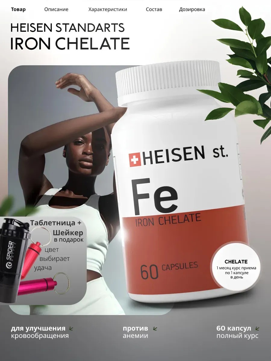 Железо Хелат - Эффективное восполнение дефицита железа! Поддержите свое здоровье с помощью железа хелат! Этот продукт содержит бисглицинат железа, форму железа с высокой биодоступностью, обеспечивающей максимальное усвоение и мягкое воздействие на ЖКТ. Наше хелатное железо - это ваш надежный помощник в поддержании нормального уровня гемоглобина и энергии! Кому подходит: Витамины для женщин: Особенно важен для женщин, испытывающих дефицит железа, в том числе для девушек и женщин 40 плюс. Поддерживает женское здоровье, восполняет дефицит витаминов железа для женщин, улучшает самочувствие и избавляет от головокружения. Витамины для мужчин энергия: Подходит и для мужчин, помогая повысить уровень энергии и поддерживать общее здоровье. Восполняет потребность в железе. Для всех: Хелат железа подходит для всех, кто нуждается в дополнительном источнике железа, независимо от возраста и пола. Преимущества: Высокая биодоступность: Хелат железа легко усваивается организмом, обеспечивая максимальную эффективность. Мягкое воздействие на ЖКТ: Не вызывает дискомфорта и побочных эффектов, характерных для других форм железа. Поддержка энергии: Помогает бороться с усталостью и повышает уровень энергии. Здоровье сердца и сосудов: Поддерживает здоровье сердца и сосудов. Поддержание гемоглобина: Способствует нормализации уровня гемоглобина.