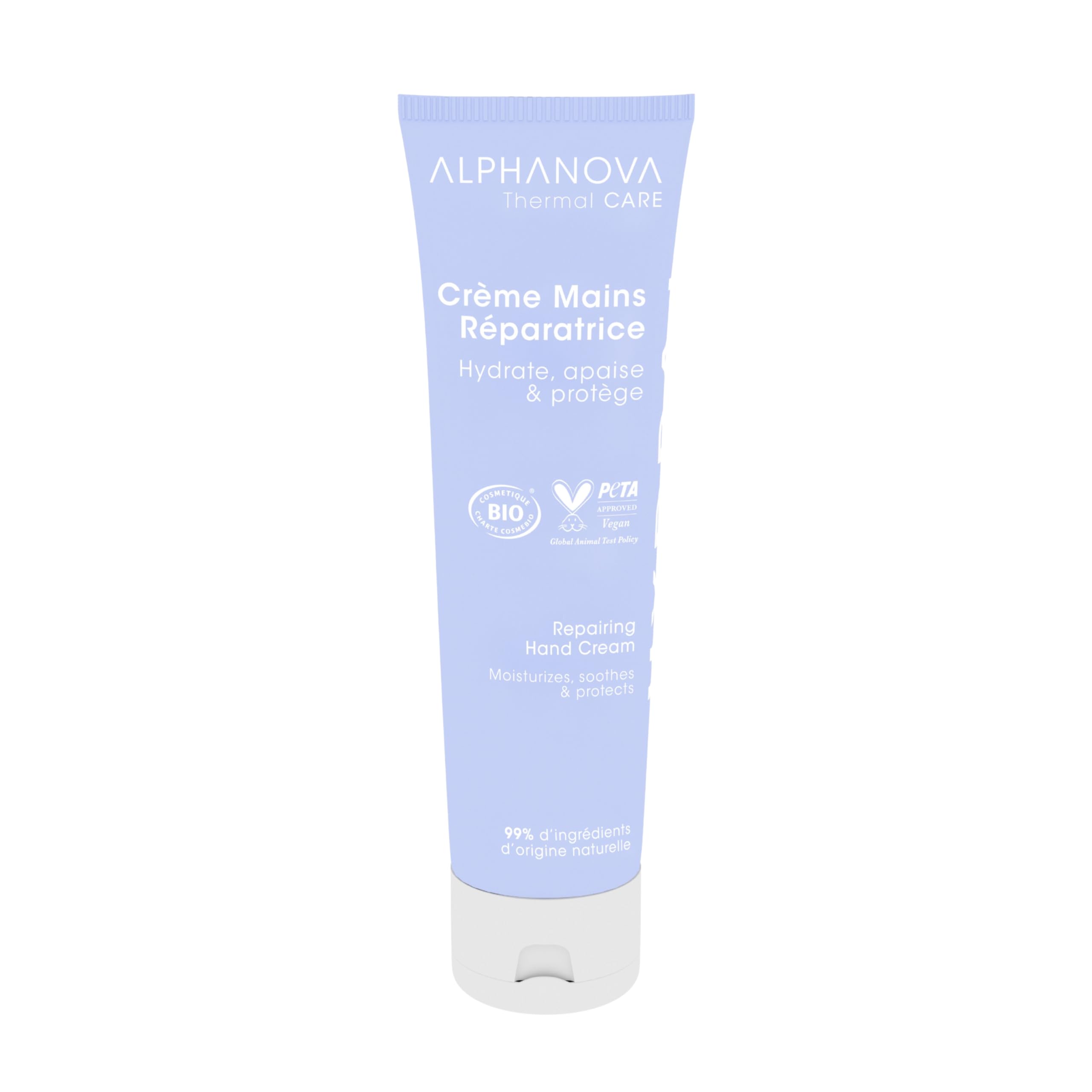 Alphanova Thermal Care Repairing Hand Cream intensely hydrates and soothes dry skin. Its protective veil leaves a silky-smooth finish. With the CICA PROTECT repairing complex. 99 naturally derived ingredients. Certified Organic. Vegan. SAFETY WARNING For external use only