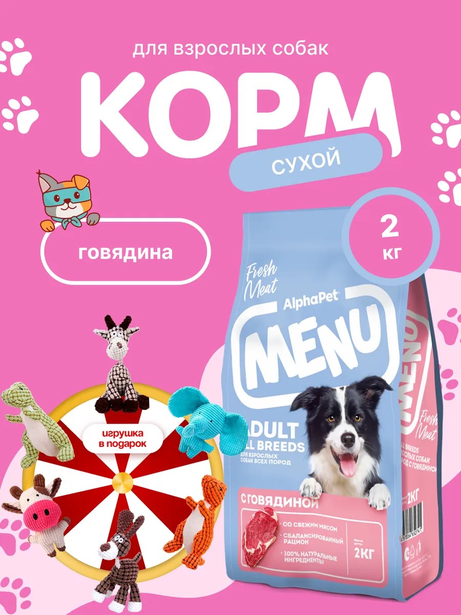 Alphapet Menu is a complete dry food for adult dogs of all breeds. The package contains 2 kg of food. Flavor: beef. Food class: economy. Consistency: dry granules.