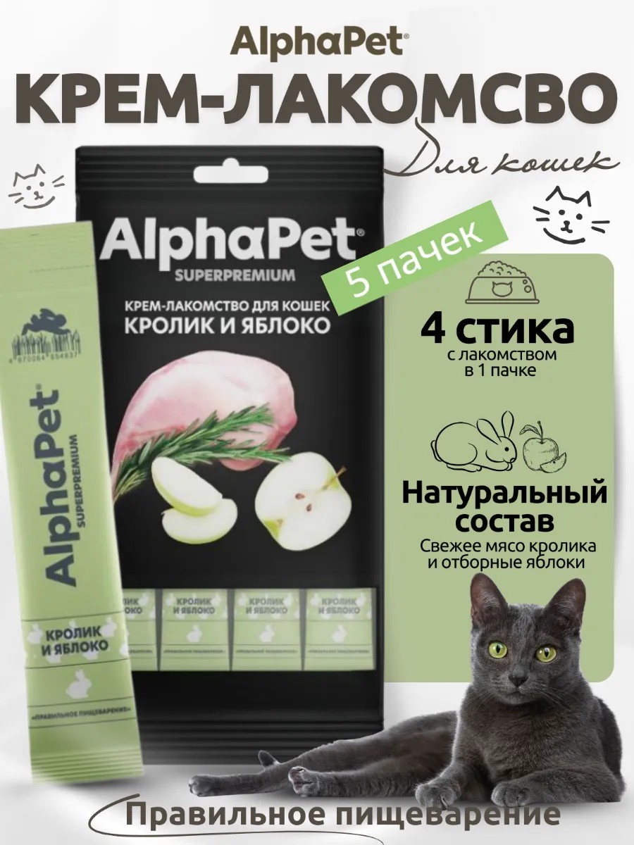 AlphaPet Крем-лакомство для кошек кролик и яблоко, 5 шт