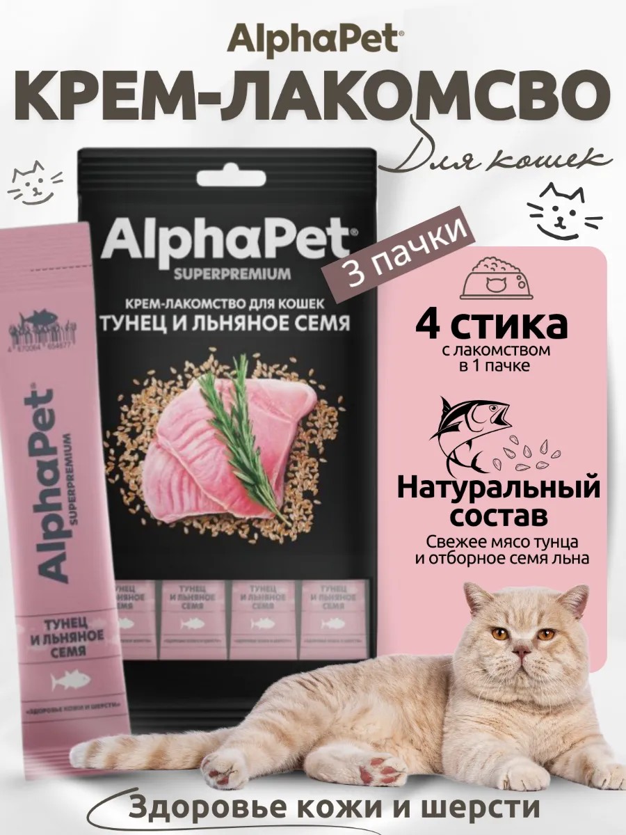 AlphaPet Крем-лакомство для кошек тунец и льняное семя, 3 шт