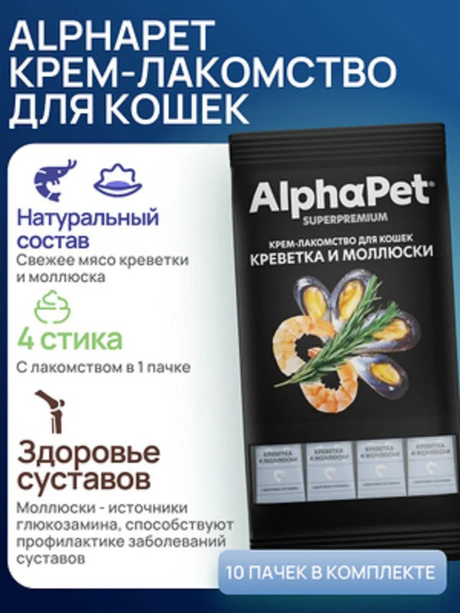 AlphaPet Крем-лакомство д/кошек с креветкой/моллюсками 4*12гр, 10шт.