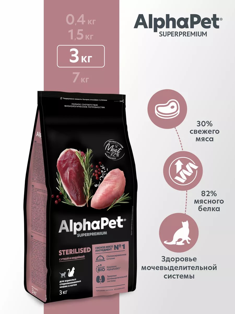 AlphaPet Superpremium cat food helps satisfy hunger and increase activity levels, featuring plenty of natural meat. AlphaPet Superpremium pet products improve the appearance of the cat's coat.