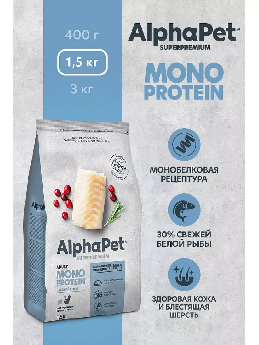 AlphaPet Сухой корм для кошек Monoprotein Белая рыба 1,5 кг