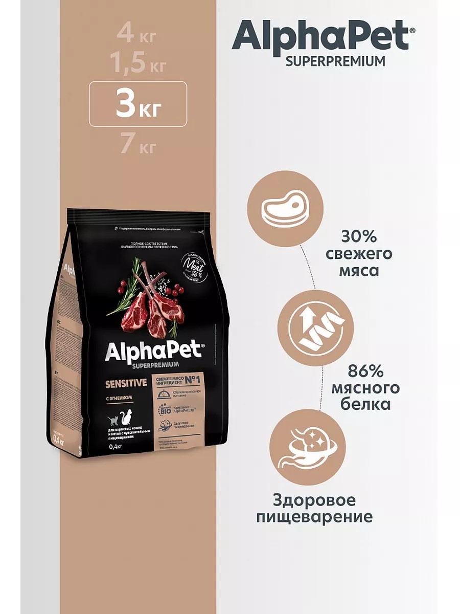 AlphaPet Сухой корм для кошек чувствительное пищеварение ягненок 3 кг