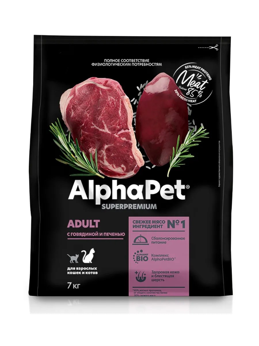 AlphaPet Сухой корм для кошек с Говядиной и печенью 7кг