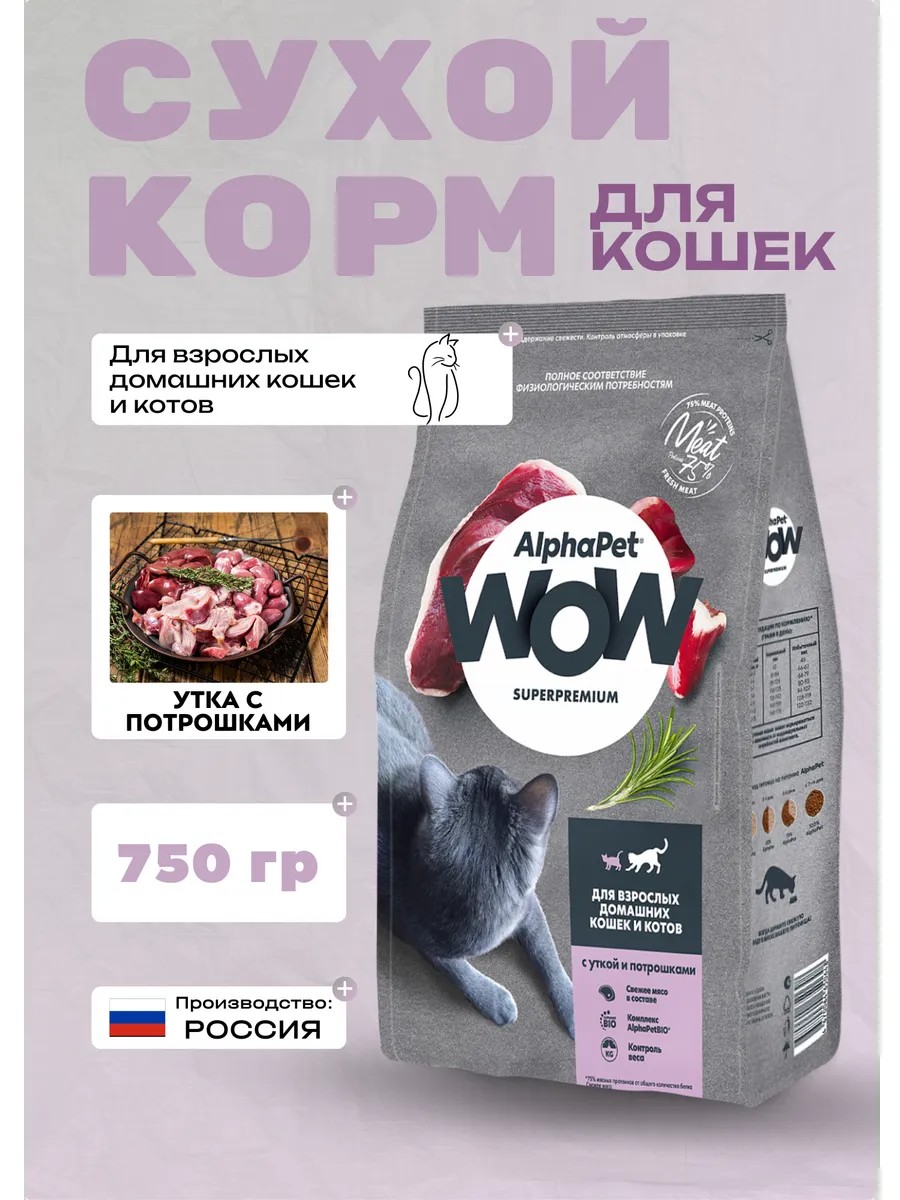 AlphaPet Сухой корм для кошек с уткой и потрошками 750 гр
