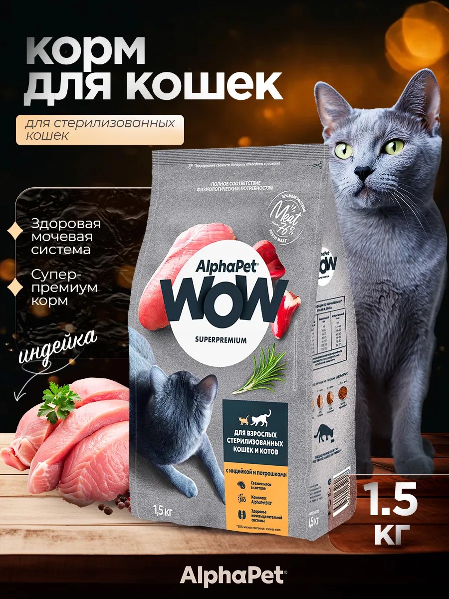 AlphaPet Сухой корм для кошек WOW STERILISED индейка 1.5 кг