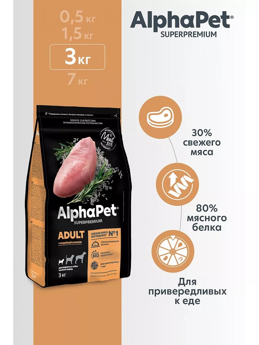 AlphaPet Сухой корм для собак мелких пород индейка рис 3 кг