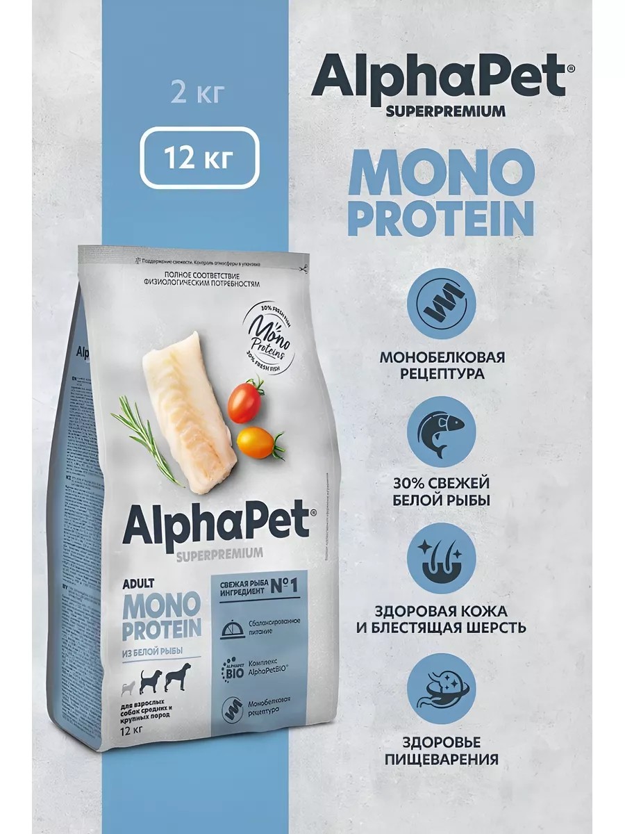 Сухой корм для взрослых собак средних и крупных пород AlphaPet Superpremium Monoprotein – это полнорационный корм для собак со вкусом белой рыбы. Корм для собак суперпремиум изготовлен по самым высоким стандартам качества и содержит высокий процент животного белка. Белая рыба в рационе Вашего питомца – отличный источник легкоусвояемого белка, микроэлементов: железа, селена, цинка, йода и витаминов B12 и D. Подходит для диетического питания, но в то же время полноценно насыщает организм питомца. За счет монобелковой рецептуры, для взрослых собак корм сухой подходит животным с пищевой непереносимостью, а значит может использоваться как гипоаллергенный корм для собак. Корм для собак сухой изготавливается по бережной технологии, сохраняя вкусовые и питательные свойства свежего мяса. Для приготовления корма используются ингредиенты, которые пригодные в пищу человеку (Human Grade). Уникальный комплекс натуральных добавок AlphaPetBIO (зеленогубый моллюск, календула, одуванчик, льняное семя, цикорий, клюква, юкка Шидигера, розмарин) содержит компоненты, которые поддерживают оптимальный обмен веществ, иммунные свойства организма, естественную микрофлору кишечника, здоровье опорно-двигательной, пищеварительной и мочеполовой систем. Оптимальное содержание Омега-3 и Омега-6 жирных кислот (омега для собак) подерживают здоровье кожи и блеск шерсти. Еда для собак изготавливается по низкозерновой рецептуре и не содержит пшеницу, кукурузу и глютен. Корм для собак сухой содержит только натуральные ингредиенты (мясо, злаки, овощи и травы), не содержит ГМО, искусственные красители и ароматизаторы. Собачий корм можно давать как корм для собак средних пород и корм для собак крупных пород. Так, Вы можете применять питание для собак как корм для немецкой овчарки, корм для лабрадора. Если Вы ищите корм для хаски, то также можете рассмотреть данный рацион. Сухой корм для взрослых собак средних и крупных пород AlphaPet Superpremium Monoprotein – это здоровый и активный питомец!