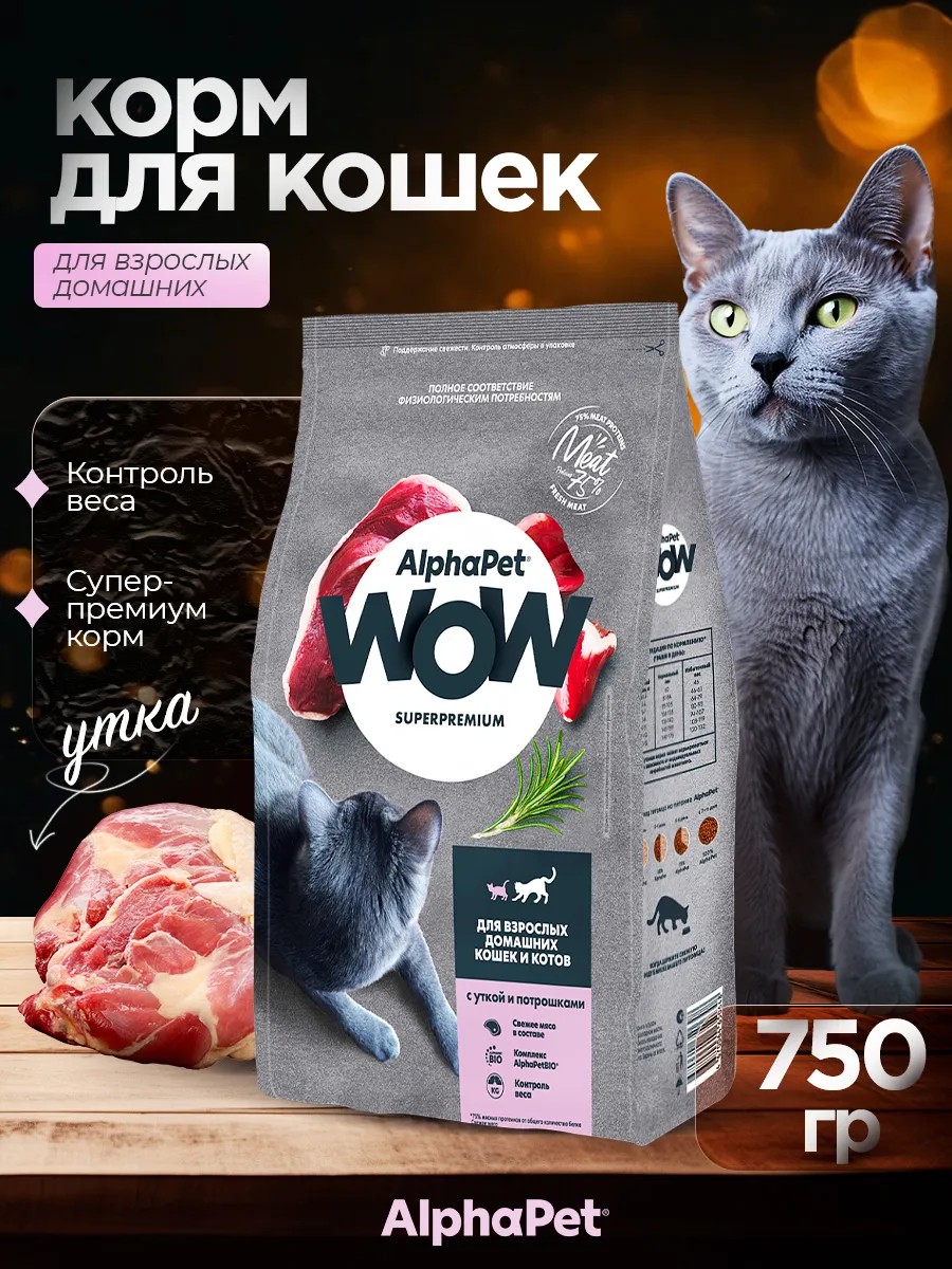 AlphaPet Сухой корм для домашних кошек WOW Adult утка 750 г
