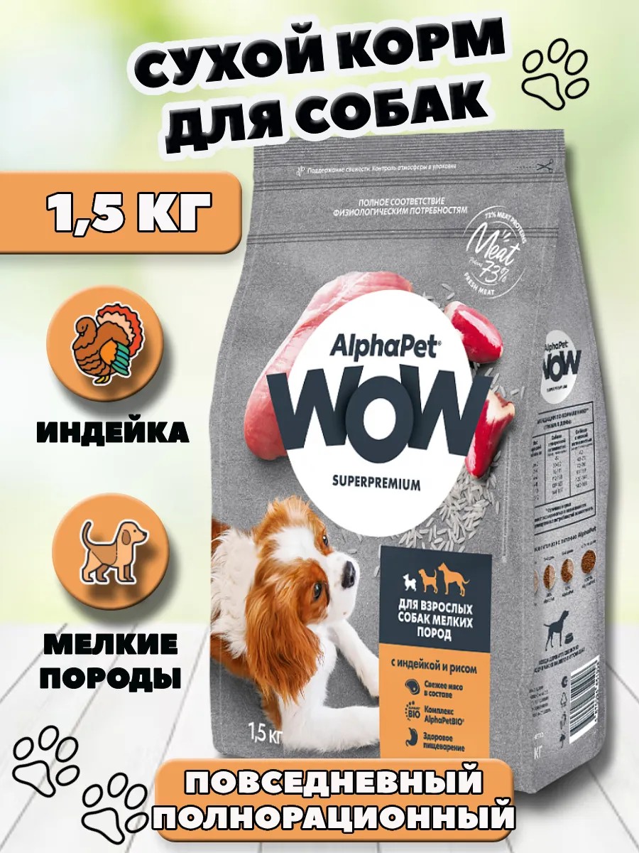 AlphaPet WOW Superpremium Сухой полнорационный корм с индейкой и рисом для взрослых собак мелких пород 1,5 кг..