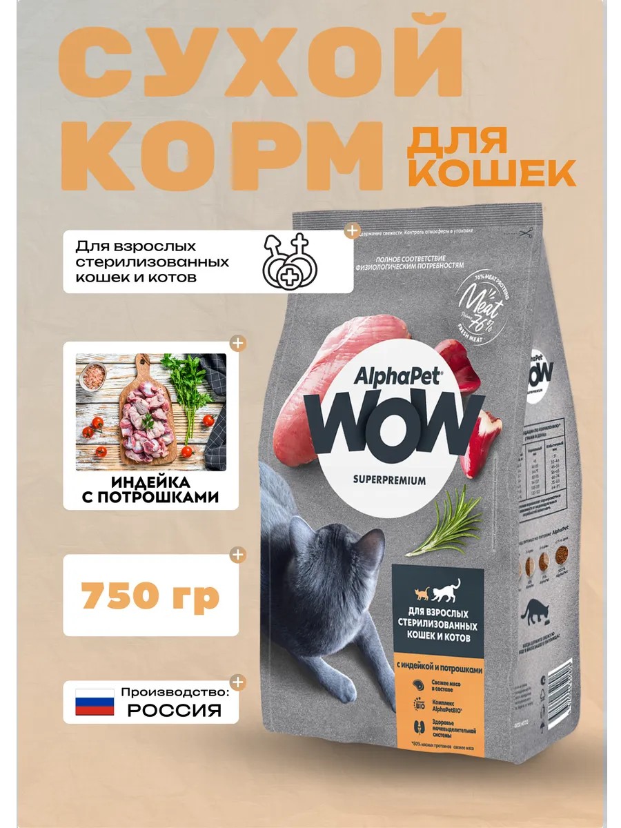 AlphaPet Сухой корм для стерил. кошек с индейкой и потрошками 750 гр
