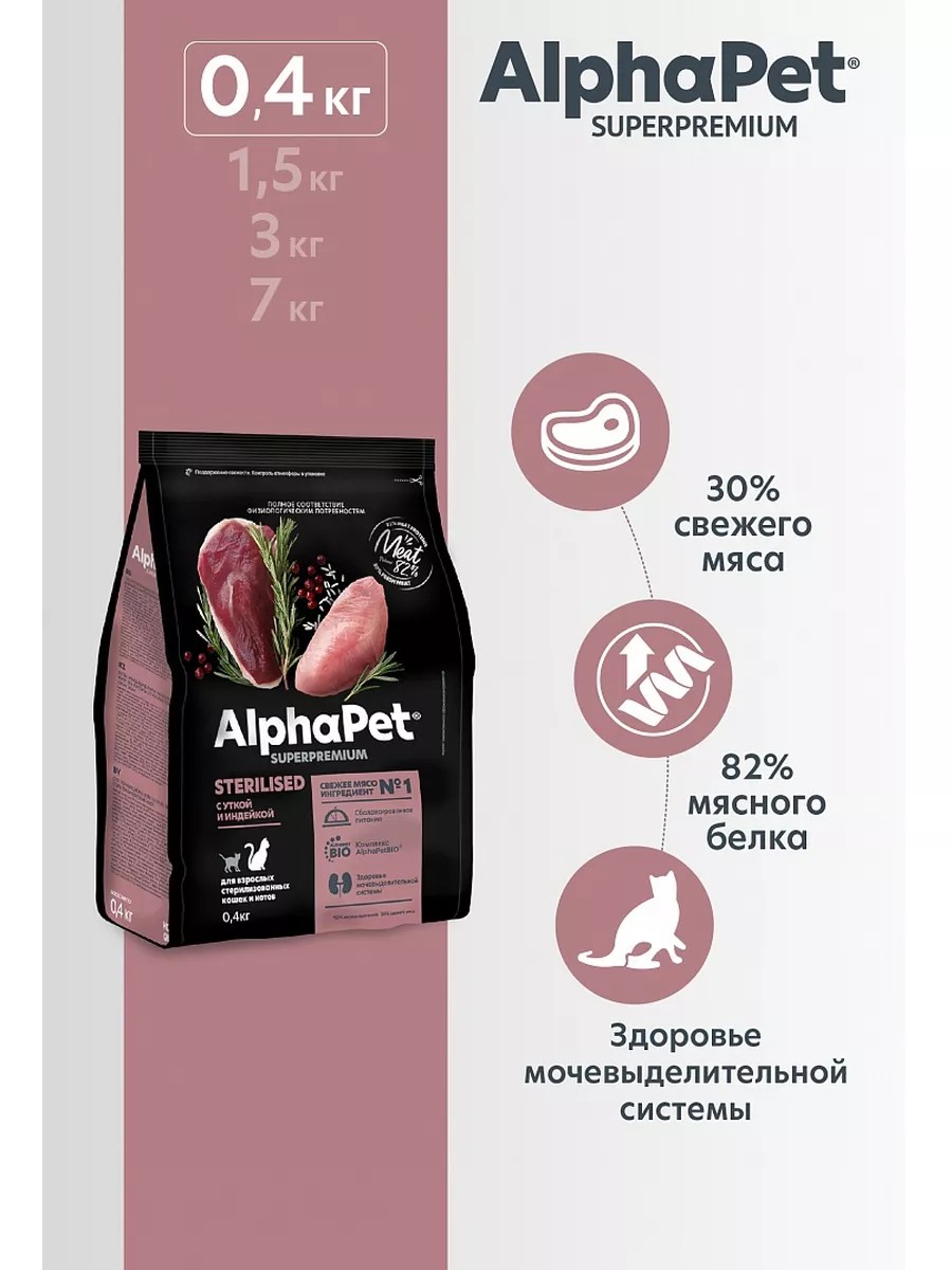 AlphaPet Сухой корм для стерилизованных кошек утка и индейка 400 гр