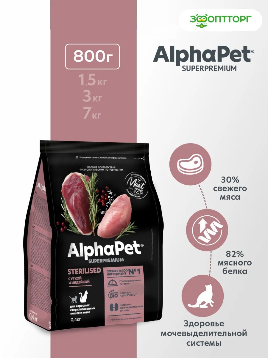 AlphaPet Сухой корм для стерилизованных кошек, Утка, индейка, 800г