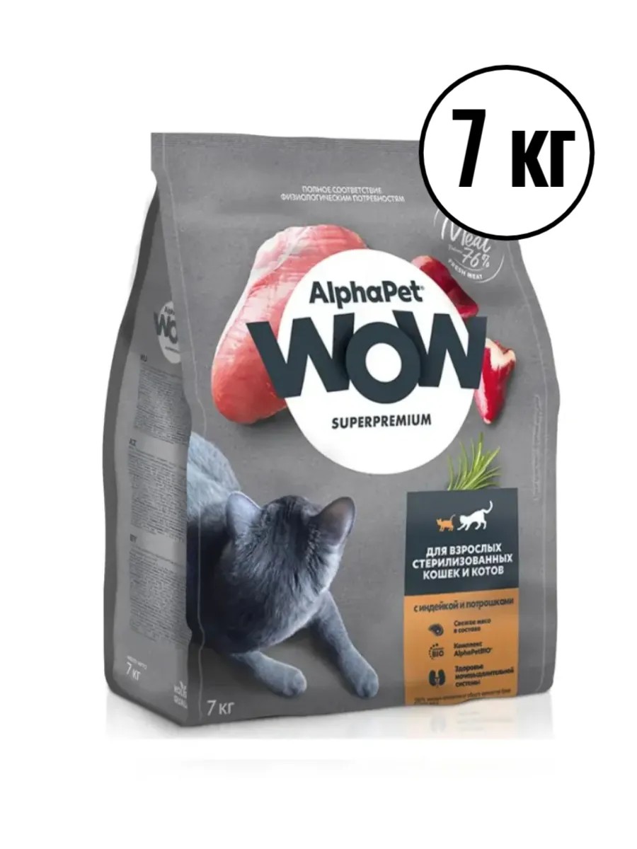 AlphaPet WOW Superpremium dry food with turkey and giblets for adult sterilized cats. Complete dry food with natural turkey meat and giblets. AlphaPet WOW Superpremium cat food is designed for adult sterilized cats and neutered cats. This dry cat food contains 76% high-quality meat protein. Fresh meat is used in the production of premium cat food. A balance of magnesium, phosphorus, and potassium promotes genitourinary health. AlphaPet WOW Superpremium cat products preserve the nutritional properties of fresh meat. This cat food is created by a Russian company using an original Swiss technology that allows for the inclusion of fresh meat. AlphaPet pet products reduce the risk of urolithiasis. The manufacturer does not use GMOs, preservatives, artificial colors, or flavors in their treats.