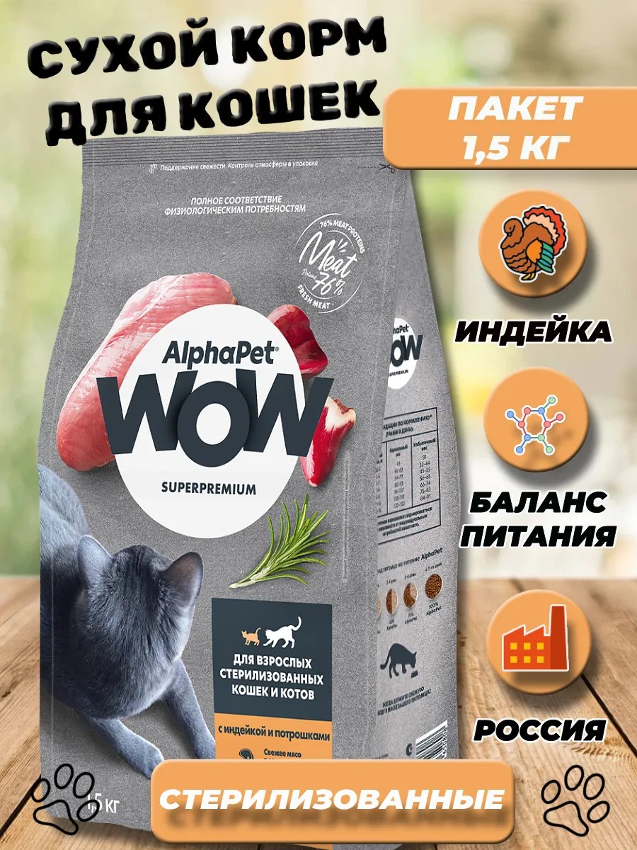 Сухой полнорационный корм с индейкой и потрошками для взрослых стерилизованных кошек и котов AlphaPet WOW Superpremium 1,5 кг.