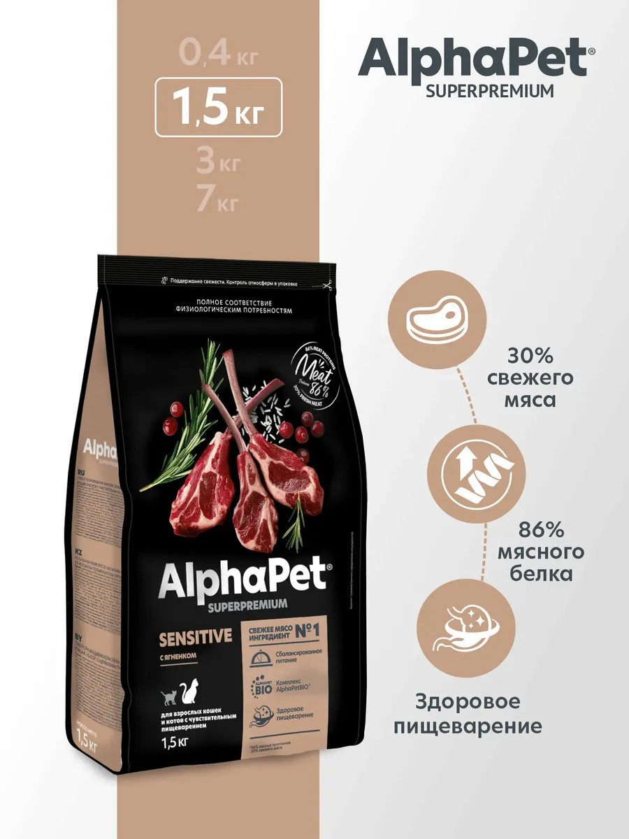 AlphaPet Сухой корм Sensitive для кошек, Ягненок 1,5 кг