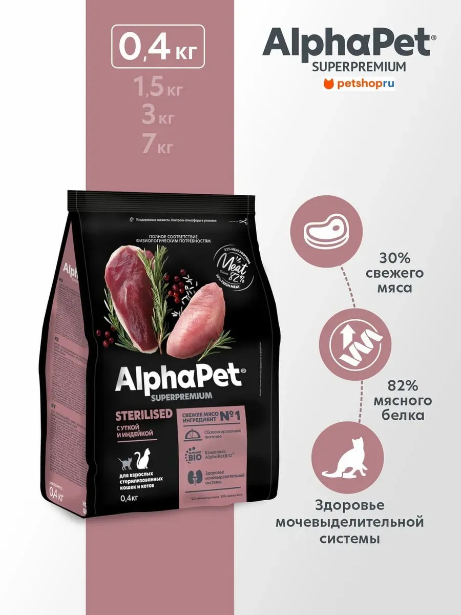 AlphaPet Сухой корм с уткой и индейкой для стерилиз. кошек, 0,4 кг.