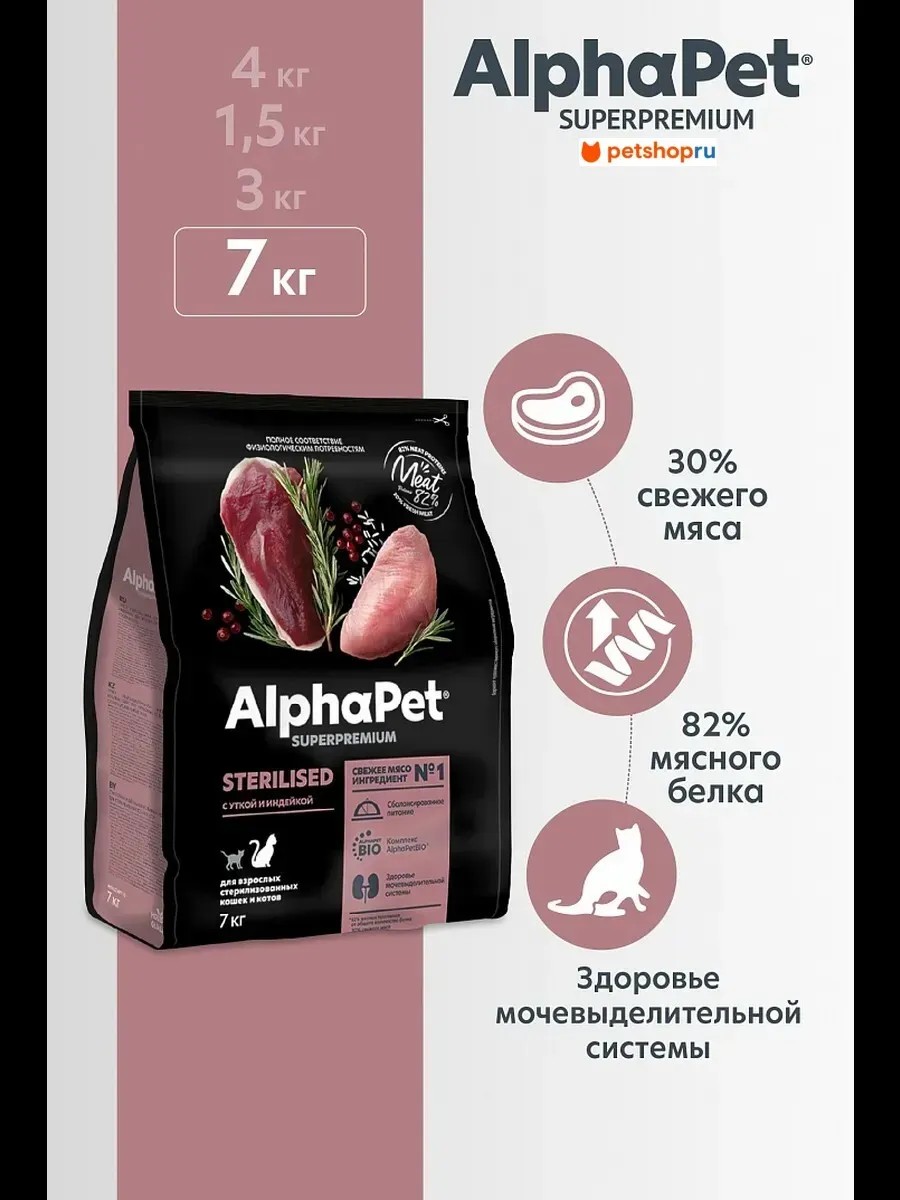 AlphaPet Сухой корм с уткой и индейкой для стерилиз. кошек, 7 кг.
