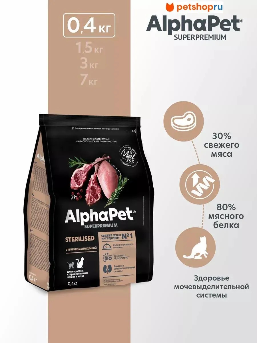 AlphaPet Сухой корм с ягненком и индейкой для стерил. кошек, 0,4 кг.