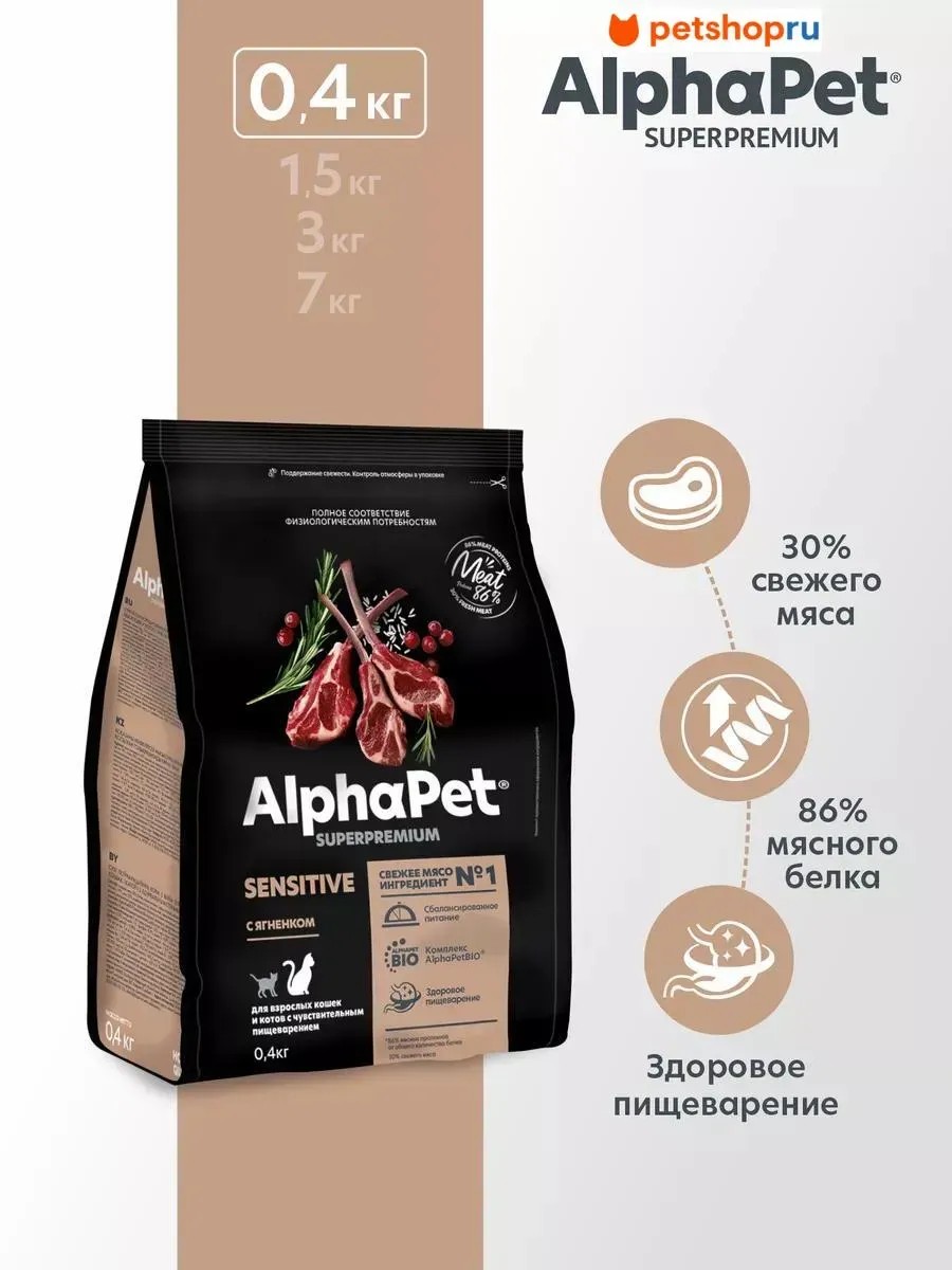 AlphaPet Сухой корм с ягненком для кошек с чувств. пищ., 0,4 кг.