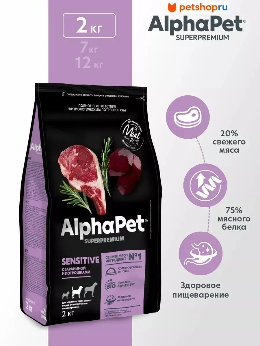AlphaPet Сухой корм с бараниной для собак с чувств. пищ., 2 кг.