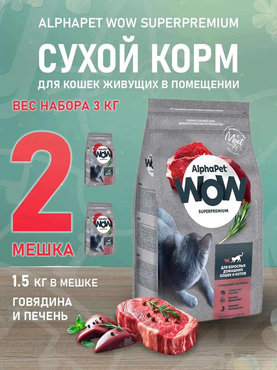 AlphaPet Корм сухой WOW для домашних кошек говядина печень 1,5 кг 2шт