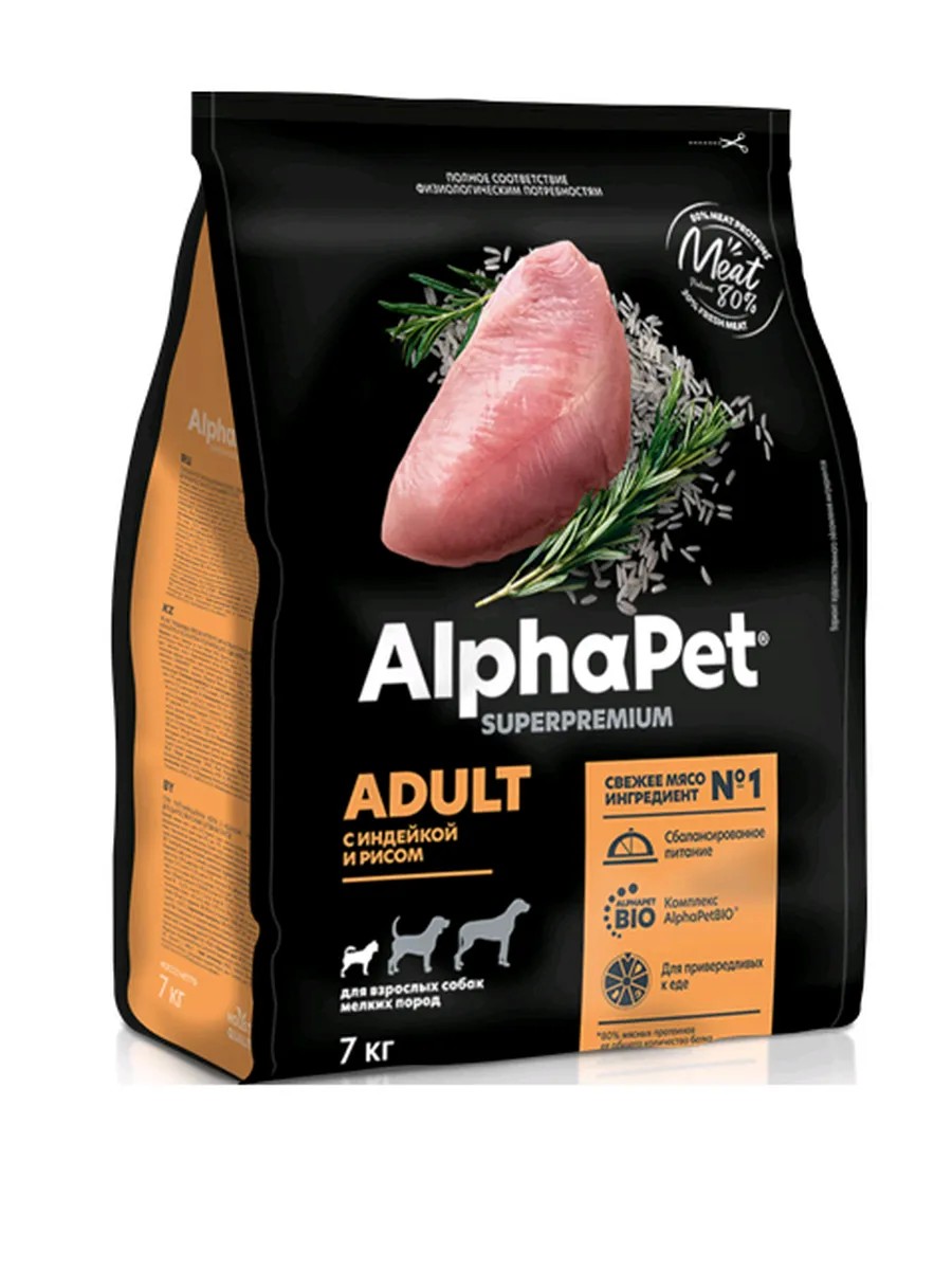 AlphaPet Корм для взрослых собак мелких пород с Индейкой и рисом 7кг