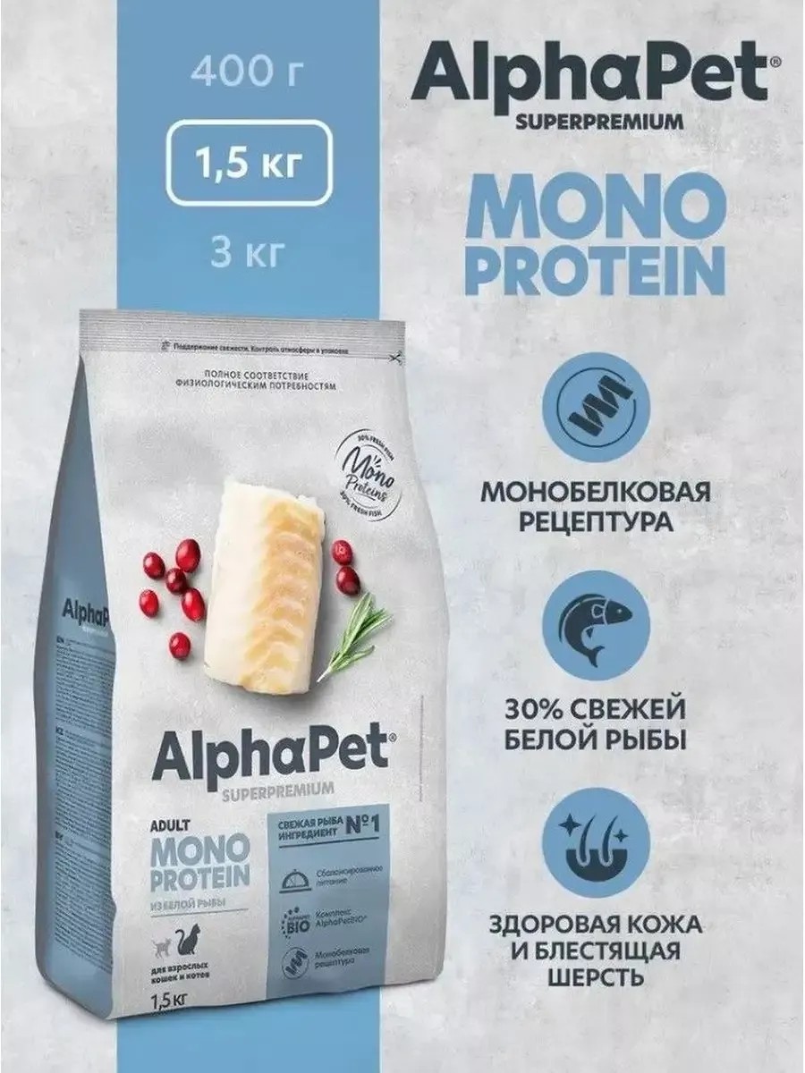 AlphaPet Корм для любых кошек Monoprotein, белая рыба 1.5 кг