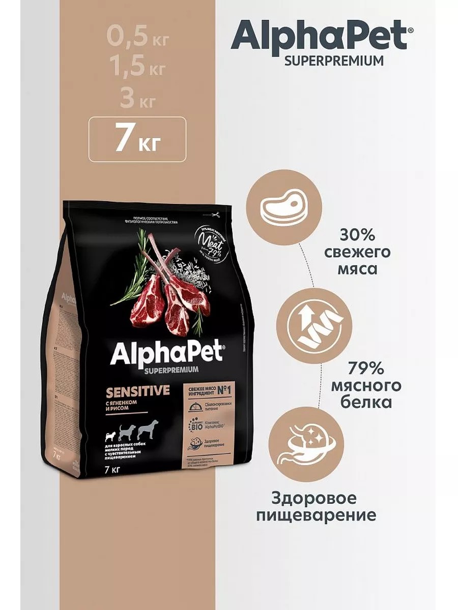 AlphaPet Корм для мелких собак с чувствительным пищ. Ягненок, рис 7кг