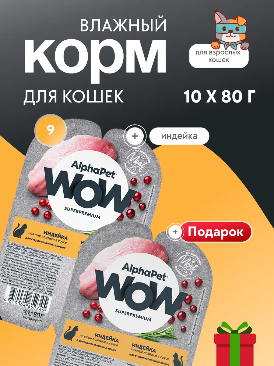 Alphapet – полнорационный влажный корм для стерилизованных кошек и кастрированных котов. В наборе 10 упаковок по 80 г. Вкус: индейка. Класс корма: супер премиум. Консистенция: кусочки в соусе.