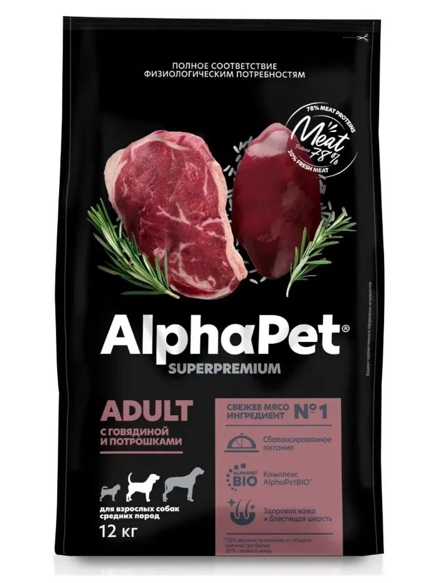 AlphaPet Корм для собак средних пород c Говядиной и потрошками 12кг