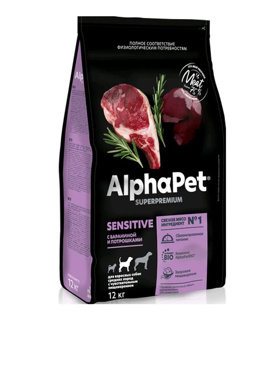 AlphaPet Корм для собак средних пород c Бараниной и потрошками 12кг