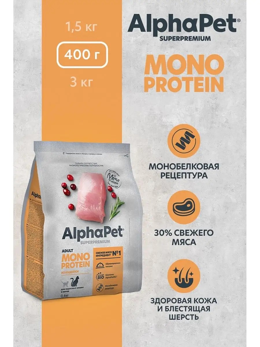 AlphaPet MONOPROTEIN корм для кошек из индейки, 400 гр