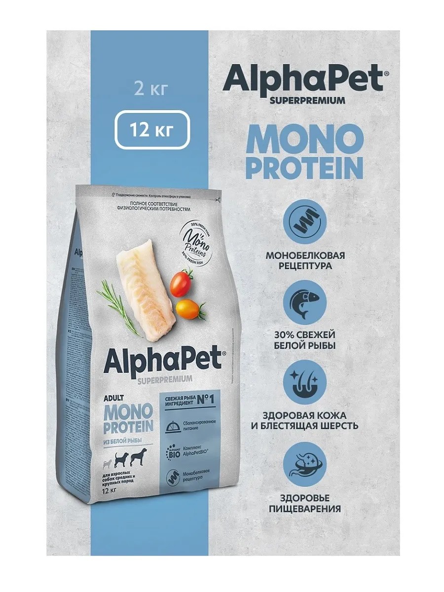 AlphaPet MONOPROTEIN для средних и крупных пород из Белой рыбы 12кг