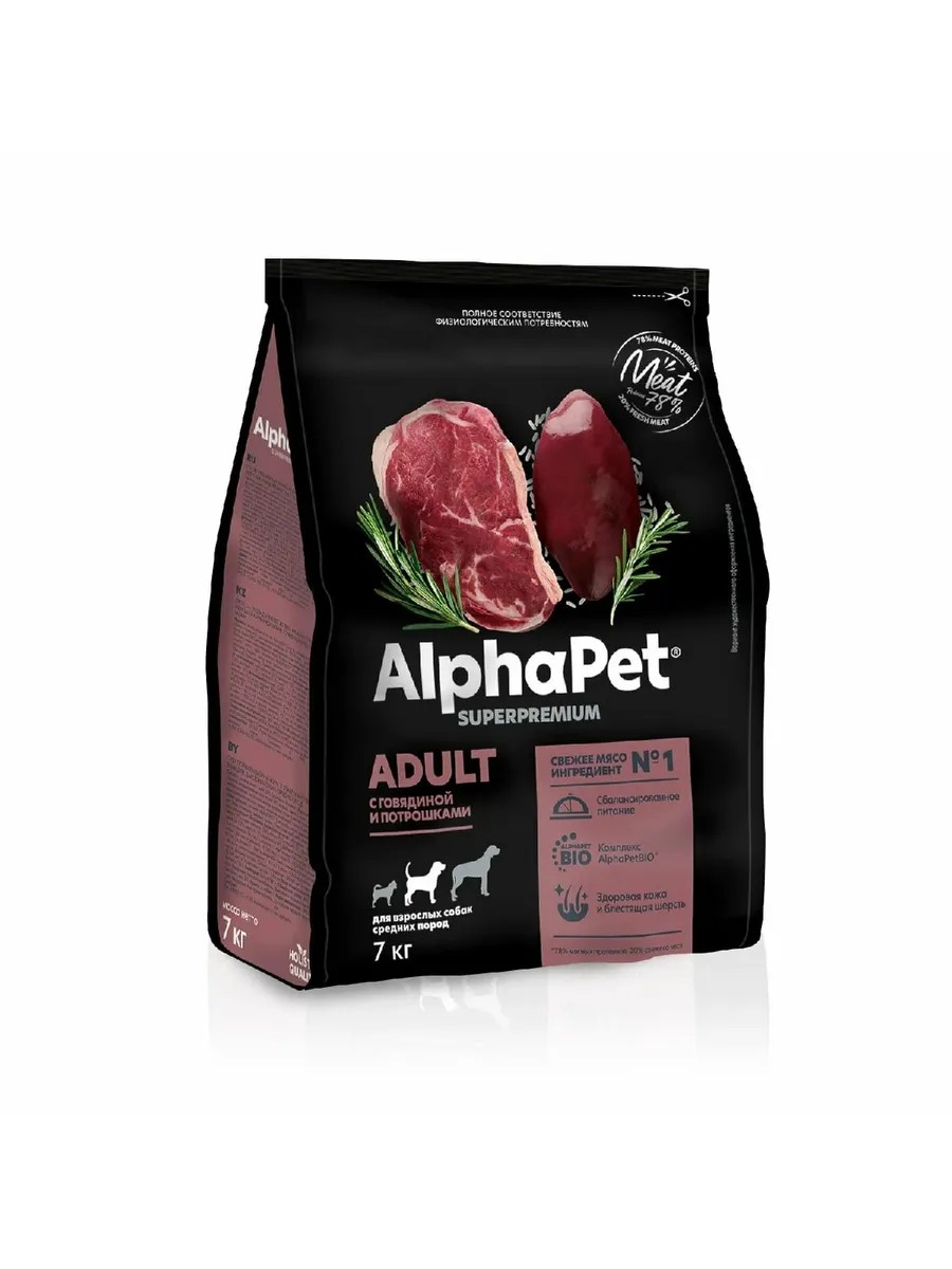 ALPHAPET SUPERPREMIUM ADULT 7 кг сухой корм с говядиной и потрошками для взрослых собак средних пород