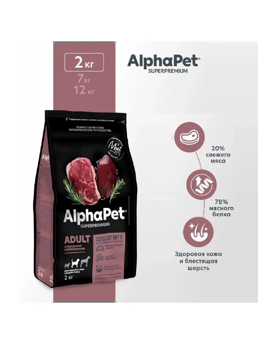 AlphaPet SUPERPREMIUM ADULT для средних собак Говядина, потрошки 2кг