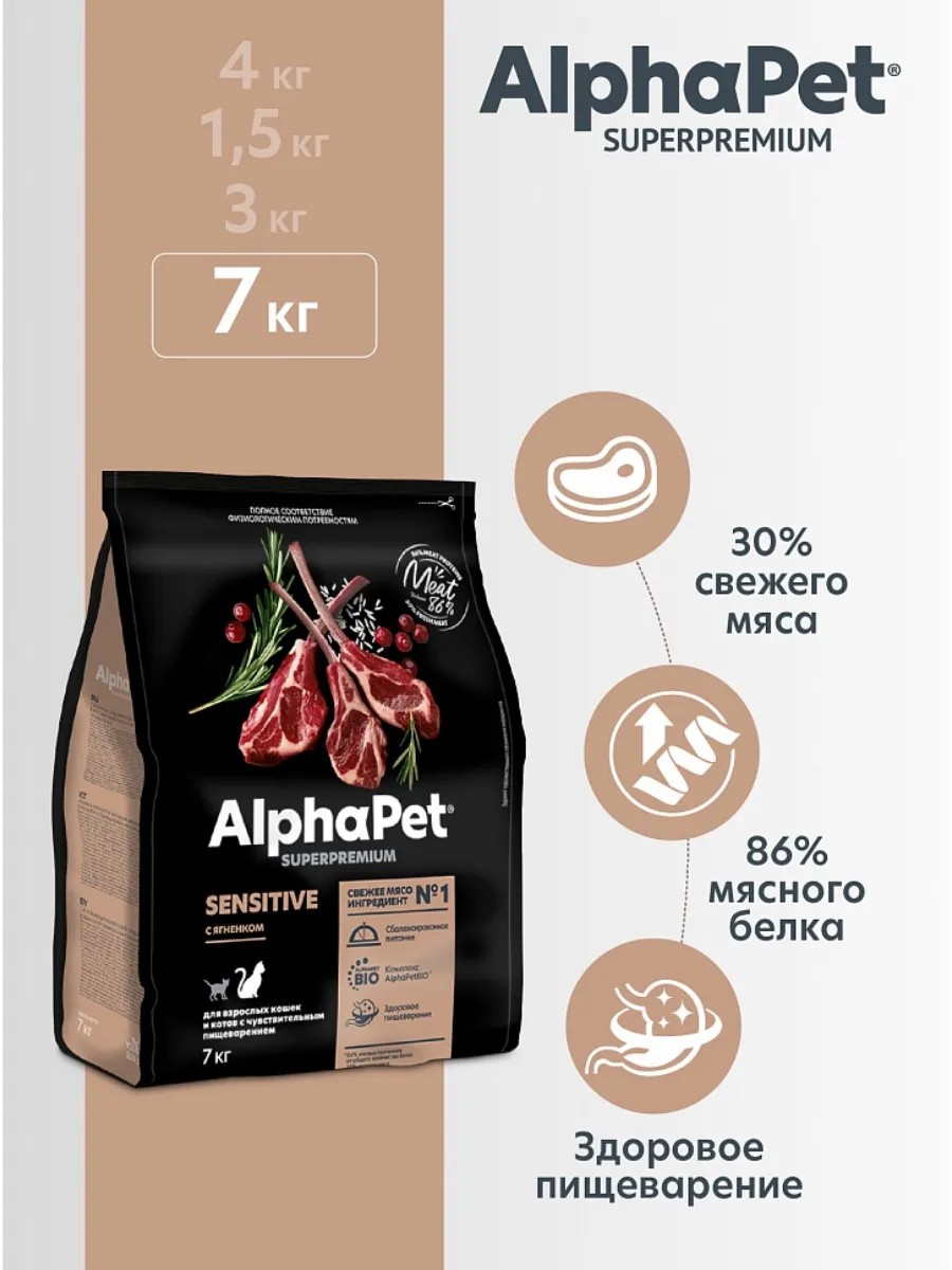 | Полное наименование товара | AlphaPet Superpremium Сухой корм для взрослых кошек и котов с чувствительным пищеварением, ягненок 7 кг |