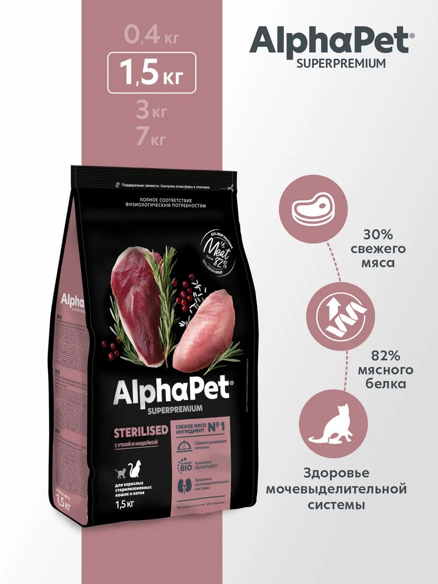 Dry cat food for sterilized cats with natural fresh turkey and duck meat. Developed under the AlphaPet Superpremium brand for adult and sterilized cats. This dry cat food meets their physiological needs to the fullest. AlphaPet Superpremium dry cat food helps satisfy hunger and increase activity levels. This dry cat food contains plenty of natural meat. AlphaPet Superpremium pet products improve the appearance of the coat. AlphapetBIO cat food supplement supports health. This cat food contains 82% natural meat protein. The food manufacturer uses turkey, duck, chicken, pork liver and heart. AlphaPet Superpremium pet products are created using Swiss technology, allowing for the inclusion of fresh meat in the diet. Premium AlphaPet Superpremium cat food provides comprehensive prevention of urolithiasis. The manufacturer does not use GMOs, preservatives, artificial colors or flavors.