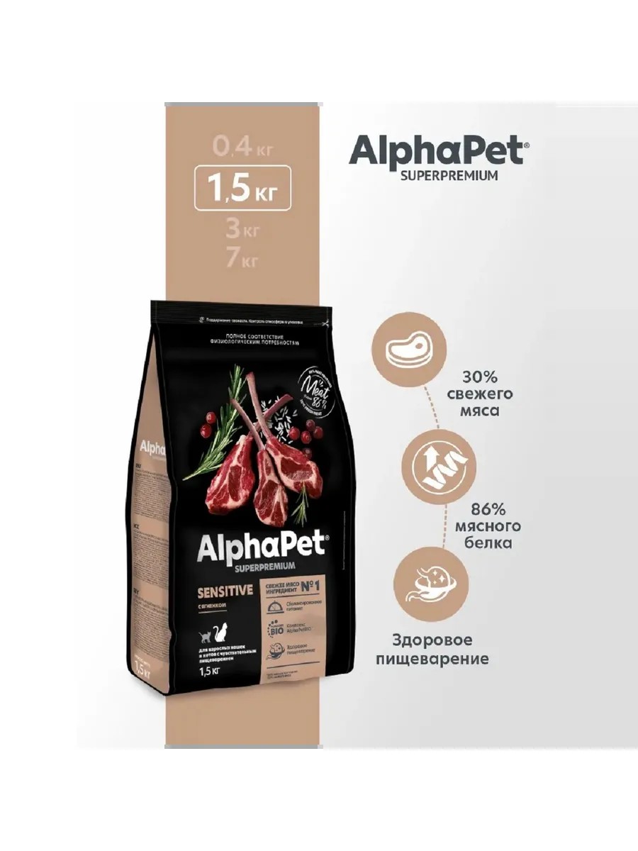 AlphaPet Superpremium Сухой полнорационный корм с ягненком для взрослых кошек и котов с чувствительным пищеварением.