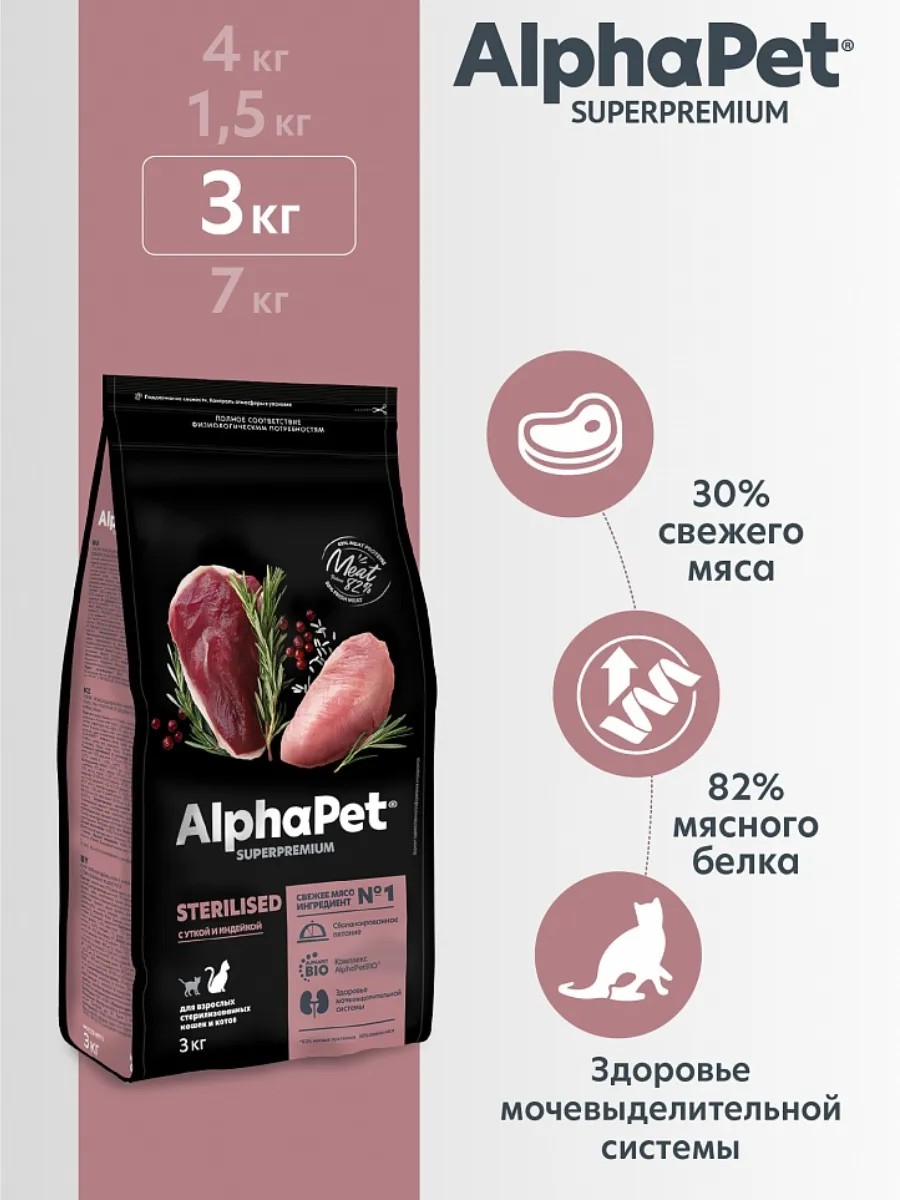| Полное наименование товара | AlphaPet Superpremium Сухой корм для взрослых стерилизованных кошек, с уткой и индейкой 3 кг |