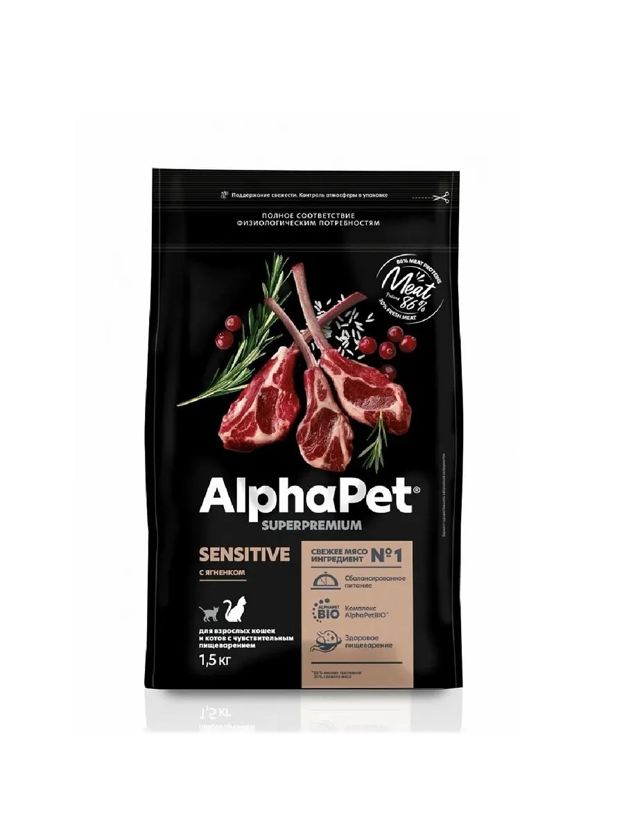 ALPHAPET SUPERPREMIUM 1,5 кг сухой корм с ягненком для взрослых кошек с чувствительным пищеварением