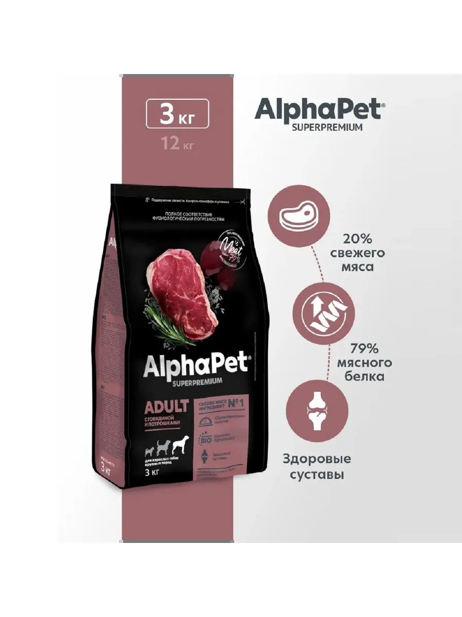AlphaPet SUPERPREMIUM для собак крупных пород Говядина, потрошки 3кг