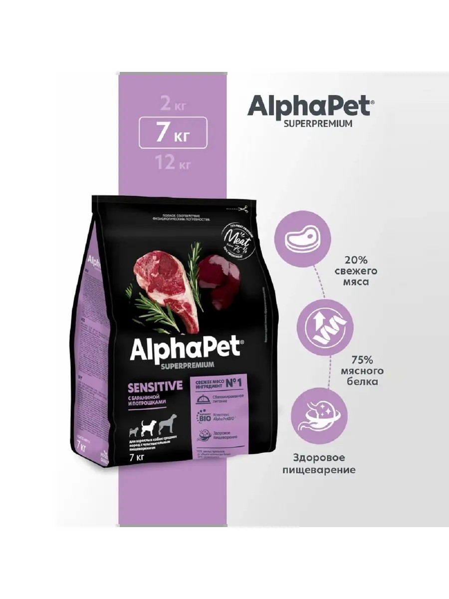 AlphaPet Superpremium / Сухой полнорационный корм с бараниной и потрошками для взрослых собак средних пород с чувствительным пищеварением